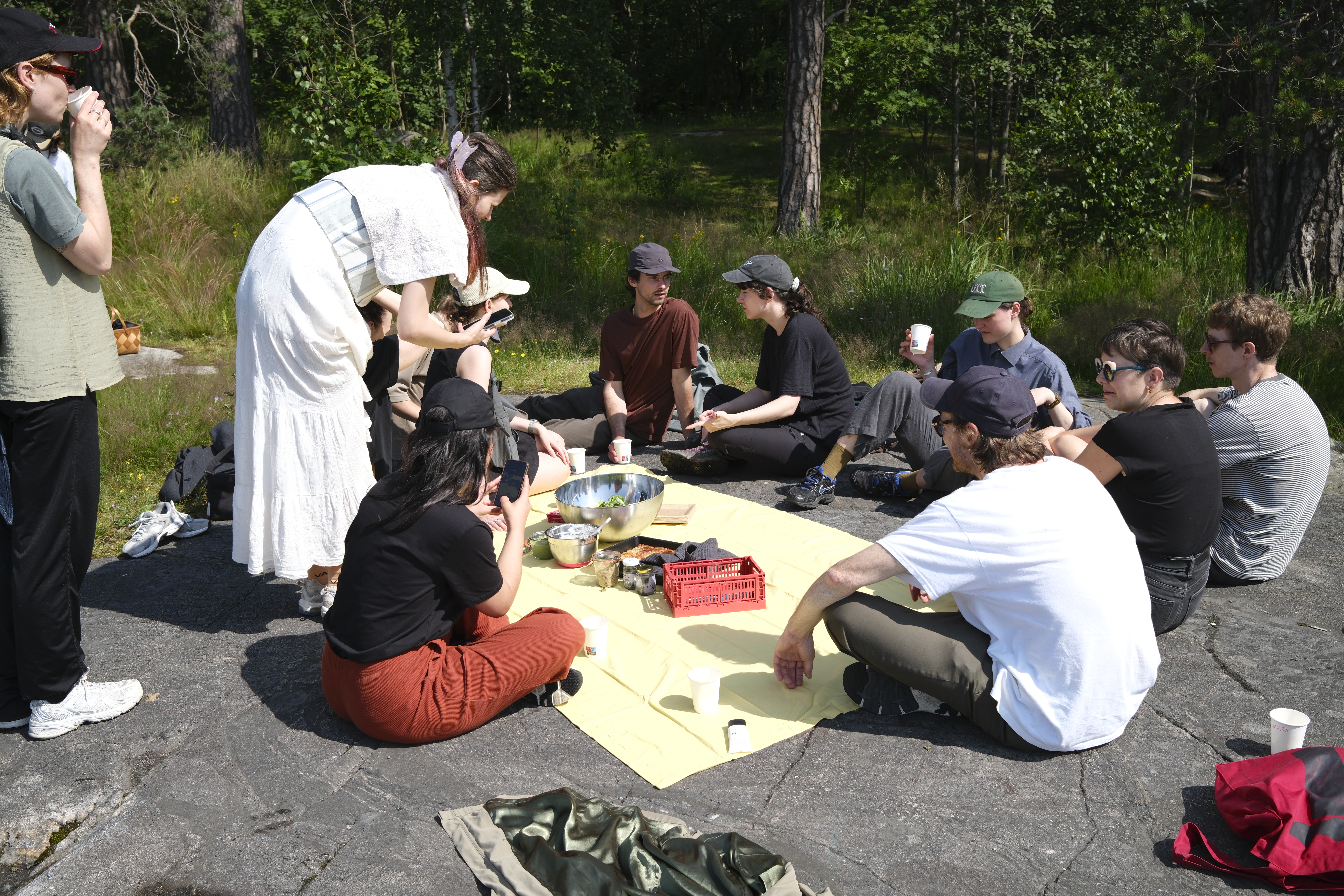 On July 13th, we held our first gathering on the island of Mustikkamaa, Helsinki. First, we set up our mobile kitchen artifact, which we built out of leftover materials to accommodate our meal preparation. Shortly after that, our group arrived, whom we got to know, and with whom we shared knowledge about edible plants growing ours us.